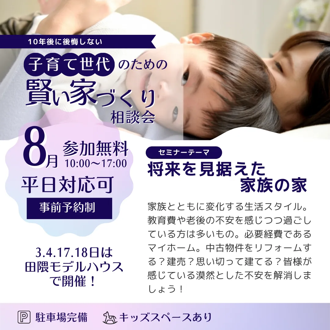 家づくり相談会 10年後後悔しないために~「お隣さんのことを気にせず、伸び伸び子育てする空間が欲しいな…」「車のローンや他の借入があるから、マイホームは無理かな…」マイホームに関する悩みはそれぞれ。漠然とした…