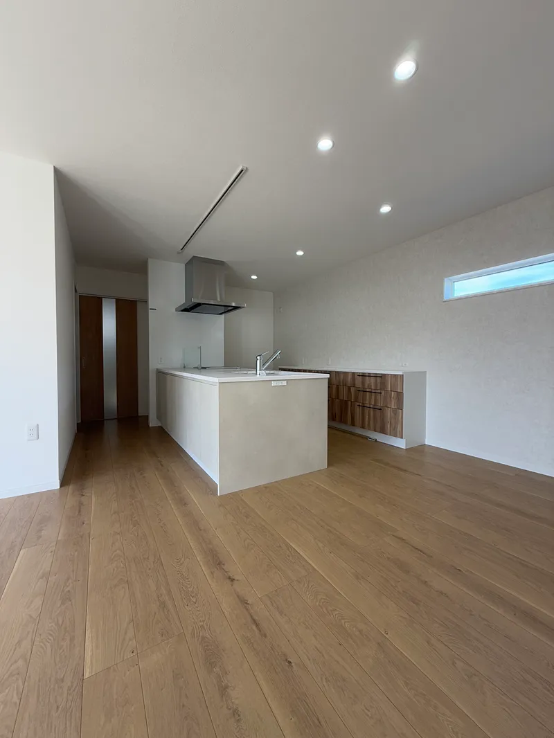 大きな窓が印象的な明るいLDK。キッチンの前壁がないので、さらに広く感じます。ベージュとホワイトで柔らかな印象のインテリア。