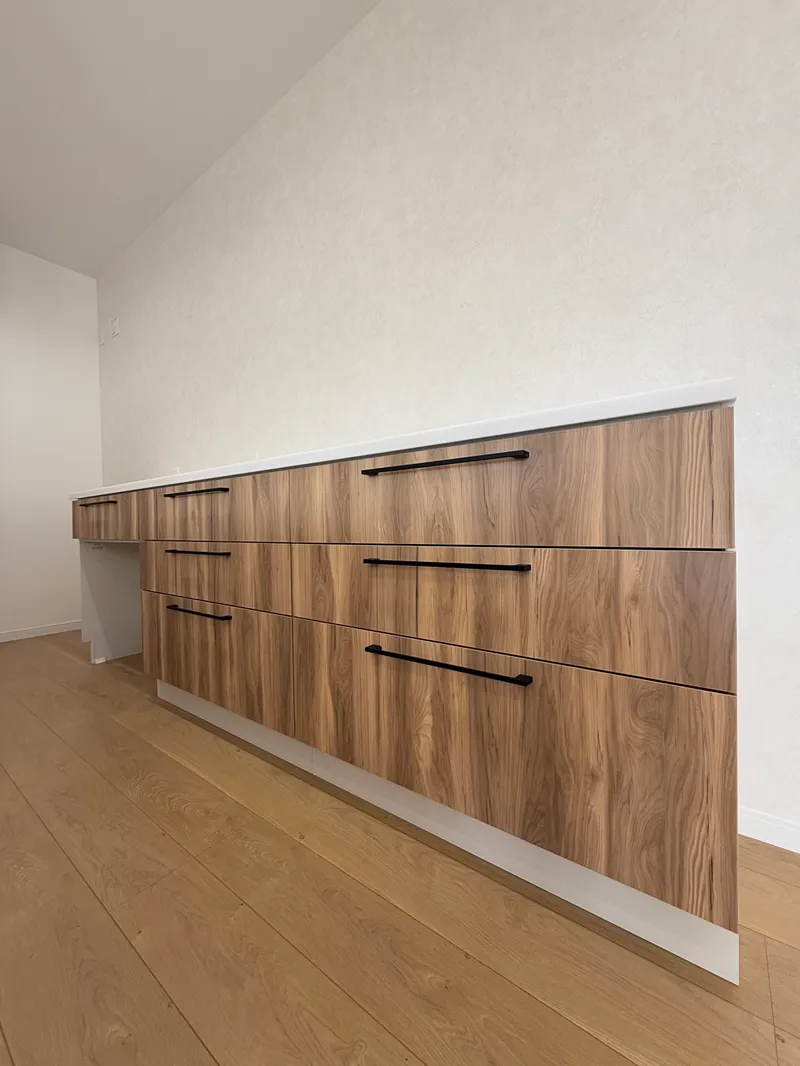 キッチン背面にも収納を追加されました。高さが揃っているので、奥行きがでます。