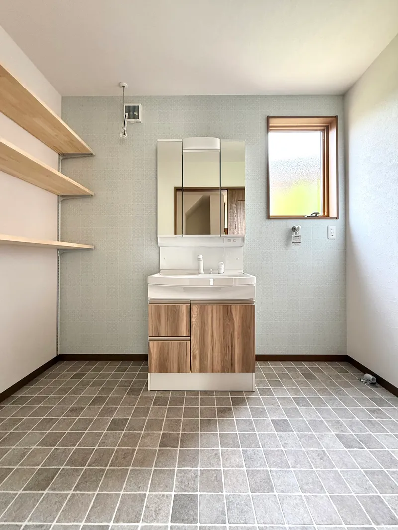 淡いブルーのアクセントクロスとタイル調のクッションフロアーが可愛らしい洗面脱衣スペース。ランドリースペースとしての利用を考え少し広めにされました。窓からの光で昼間は照明要らずです。
