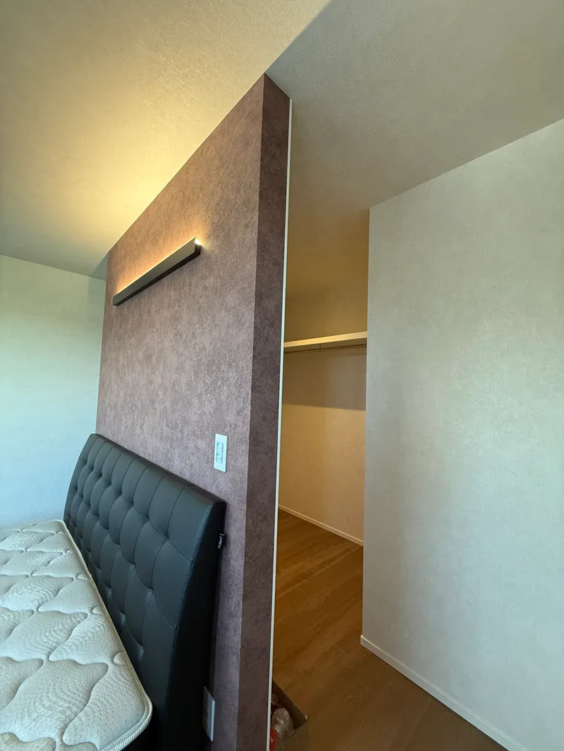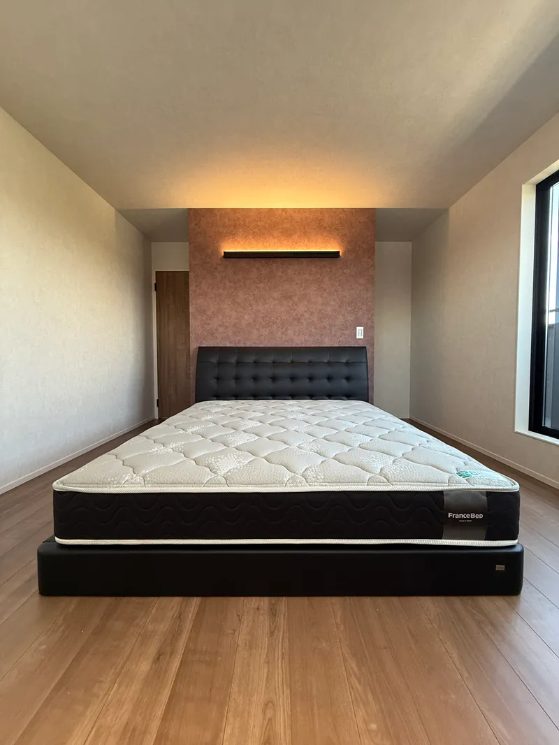 主寝室は暖色の間接照明で落ち着いた空間づくりを。