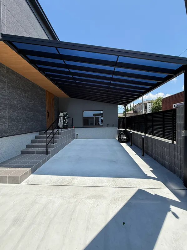 軒と併せて設置されたカーポート。雨の日はもちろん、お子様の遊び場としても利用可能です。